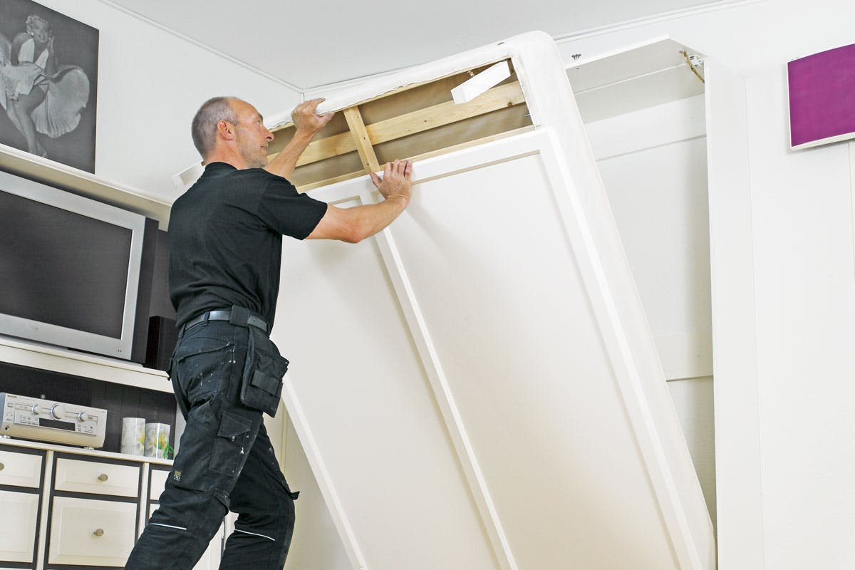 Sidorna av mdfskiva och ramlisterna av furu sågas till på förhand. Därefter får du anpassa delarna efter golvsocklar, ev. paneler och ojämna väggar. Skåpet sätts ihop med lim och dyckertar som slås i med tryckluft. Det går verkligen snabbt och när limmet har härdat kan skåpet utan problem bära madrassen.