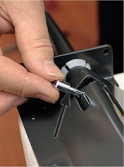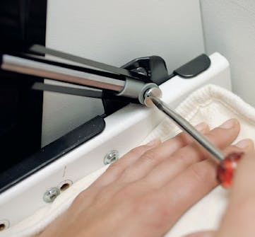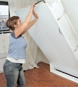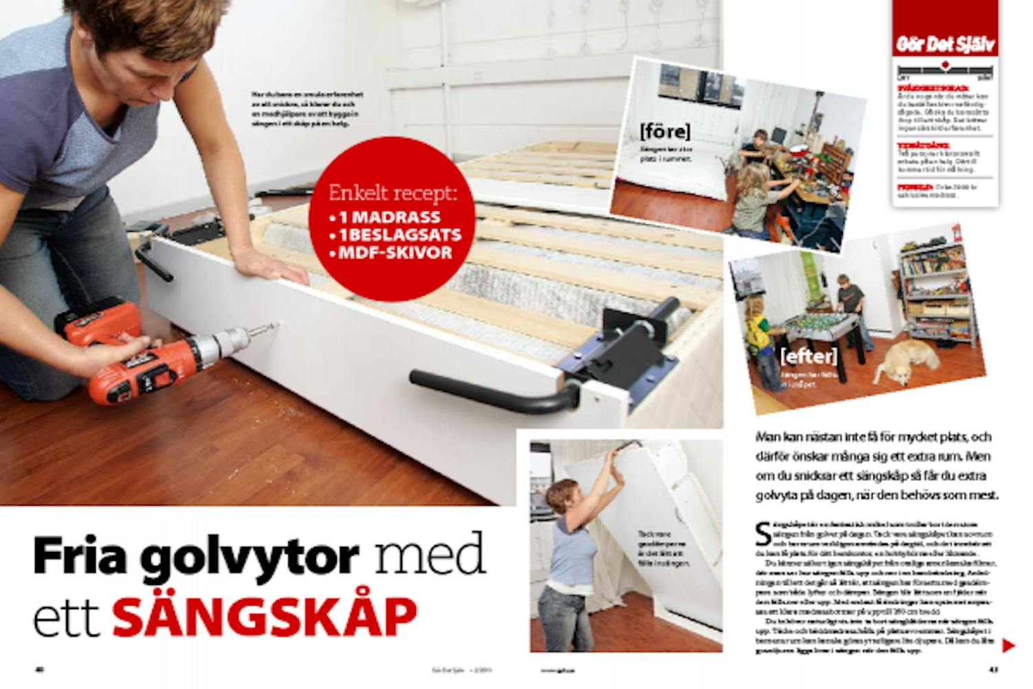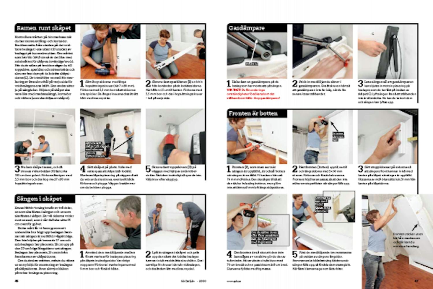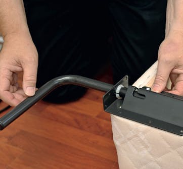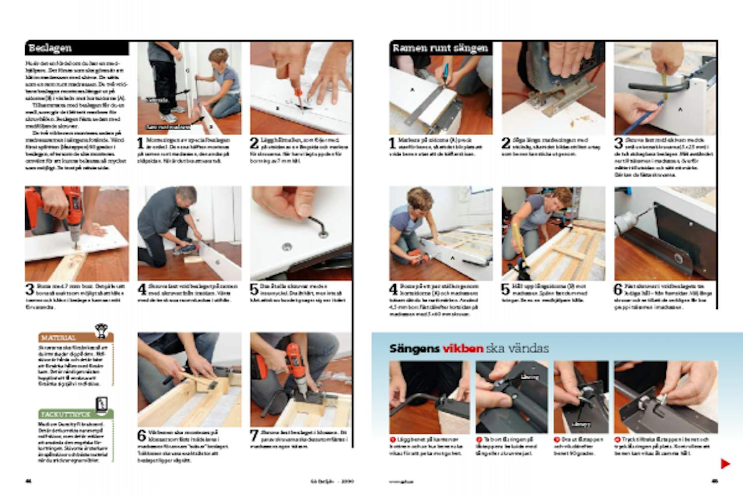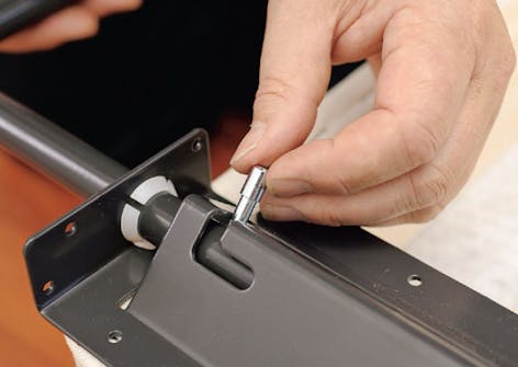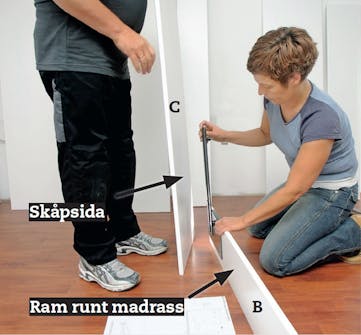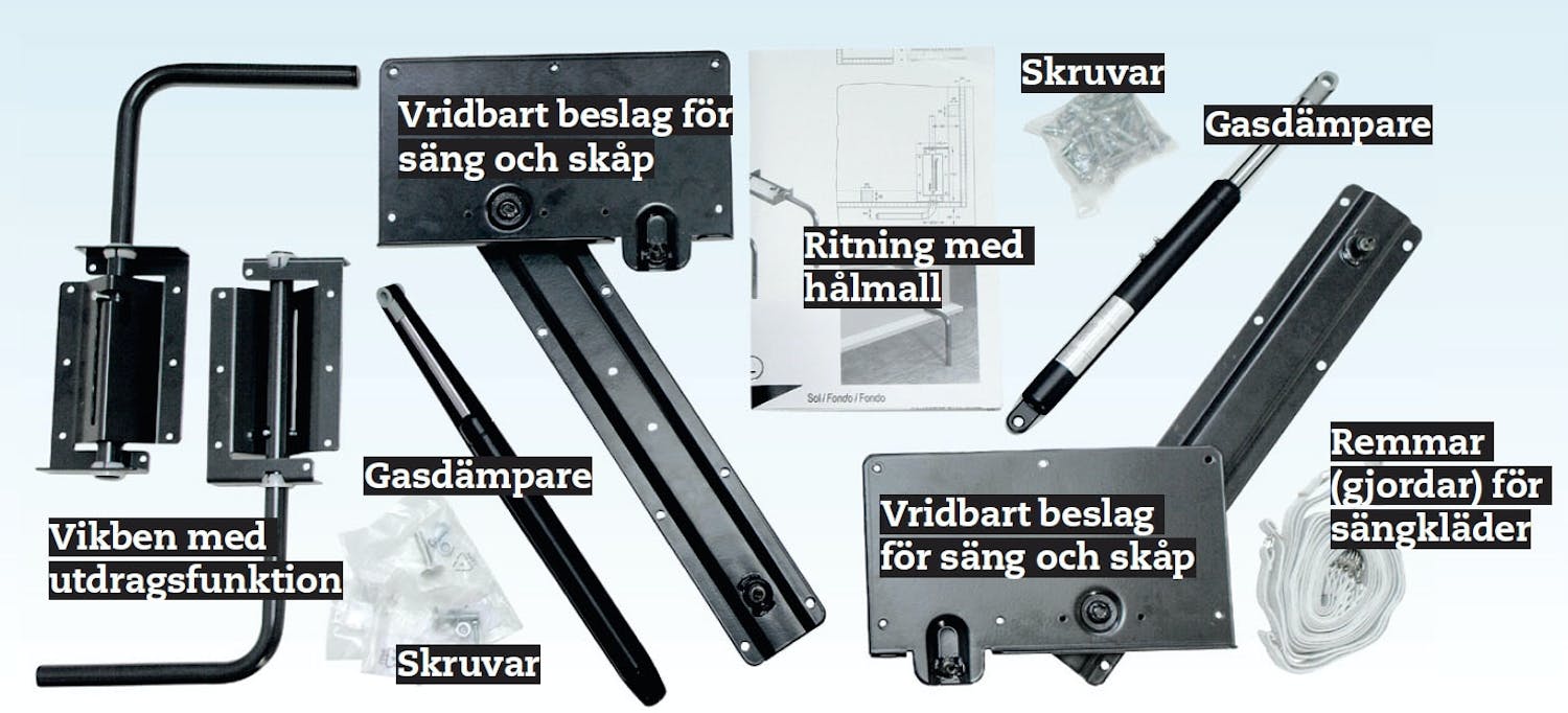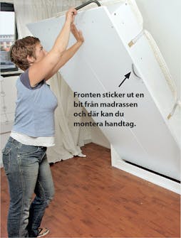 Monteringen av specialbeslagen är enkel. Den ena hälften monteras på ramen runt madrassen, den andra på skåpsidan. Här är det bra att vara två.