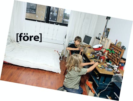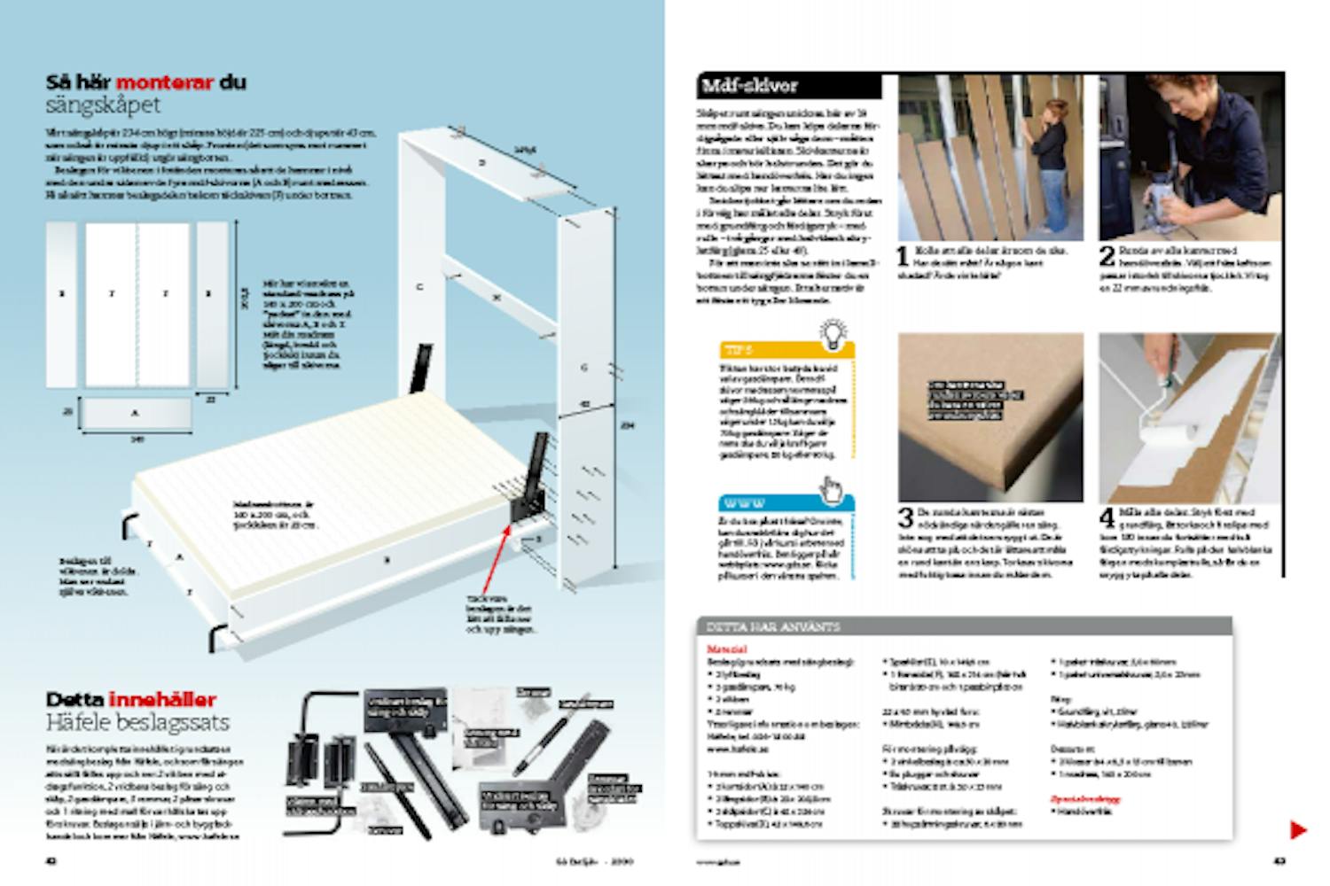 Skåpet runt sängen snickras här av 19 mm mdf-skiva. Du kan köpa delarna färdigsågade eller själv såga dem - måtten finns i materiallistan. Skivkanterna är skarpa och bör helst rundas. Det gör du lättast med handöverfräs. Har du ingen kan du slipa ner kanterna lite lätt.