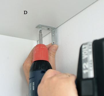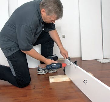 Skruva fast sparklisten (E) en bit in från kortänden på de lodräta sidorna. Här håller vi 5 cm till kanten. Förborra med 5,5 mm borr och dra i hopsättningsskruvar - två på varje sida.