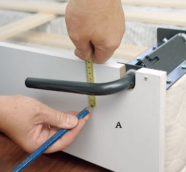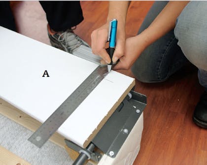 Markera på sidorna (A) precis utanför benen, så att det blir plats att vrida benen utan att de träffar skivan.