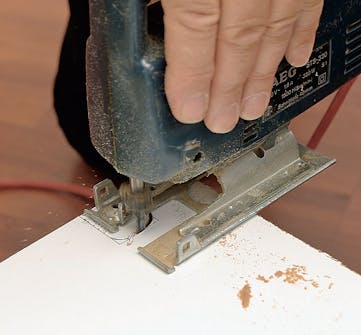 Såga längs markeringen med sticksåg, så att det bildas ett litet urtag som benen kan sticka ut genom.