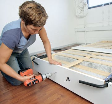 Borra på ett par ställen genom kortsidorna (A) och madrassens träram där du har satt märken. Använd 4,5 mm borr. Fäst därefter kortsidan på madrassen med 5 x 60 mm skruvar.