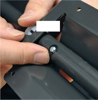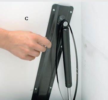 Stick in medföljande skruv i gasdämparen. Dra åt skruven hårt så att gasdämparen inte far iväg, när du lite senare lossar stålbandet.