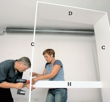 Nu kan skåpet resas, och då skruvas mittenbrädan (H) fast cirka 100 cm över golvet. Förborra återigen med 5,5 mm borr och dra ihop med 7 x 80 mm hopsättningsskruvar.