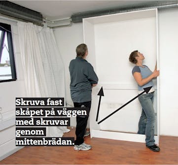 Sätt skåpet på plats. Kolla med vattenpass att skåpet står lodrätt. Markera skåpets placering på väggen så att du vet var du ska skruva, eventuellt både förborra och plugga. Väggen bestämmer om du behöver plugga.