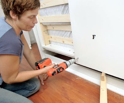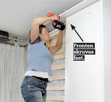 Fäst fronten (botten) upptill, nertill och längs sidorna med 5 x 60 mm skruvar. Förborra och försänk skruvarna. Frontens höjd har anpassas, så att den inte stöter emot sparklisten när sängen fälls upp.