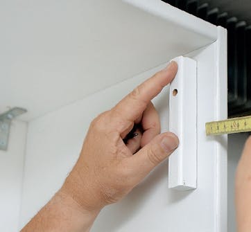 Sätt stoppklossar på sidorna så att sängens front hamnar i nivå med kanten på skåpet när sängen är uppfälld. Klossarna av mdf-bitar sätts här 20 mm från kanten på skåpsidorna.
