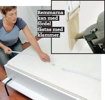 Fäst de medföljande tre remmarna på utsidan av sängens långsidor. Remmarna ska hålla fast sängkläderna när sängen fälls upp, så fördela dem strategiskt. Här fästs klamrarna genom läderbitar.
