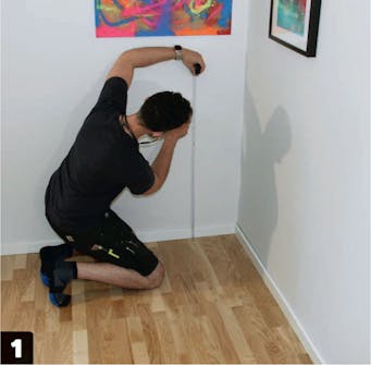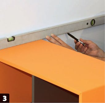 När skåpen är på plats, markerar vi deras placering på väggen, så att vi vet var vi ska sätta läkten.