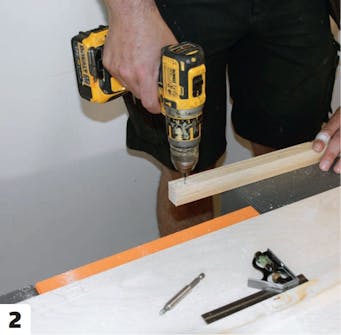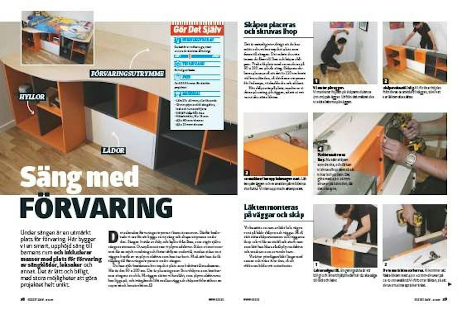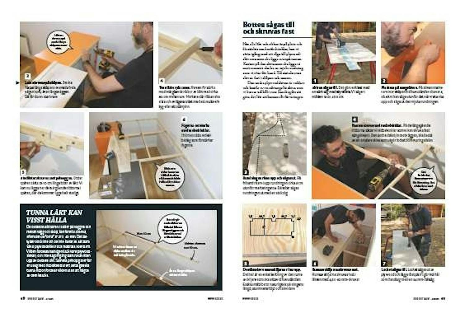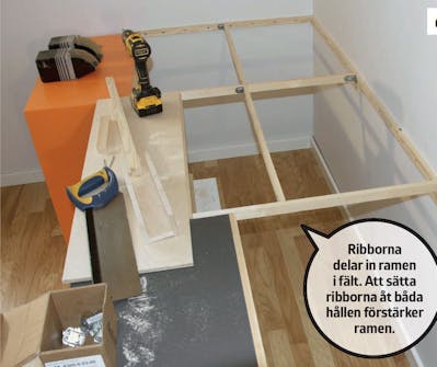 Ramen förses med möbelvinklar. På de längsgående ribborna sätter vi möbelvinklar som vi kan skruva fast sängskivan i. Den andra delen, in mot väggen, ska bestå av en smalare skiva som utgör locket till förvaringsdelen.