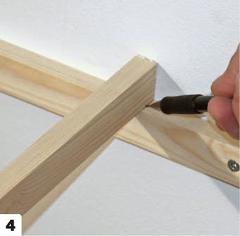 Vi sätter ytterligare läkt längs med ramen och tvärs över den, så att ribborna bildar ett rutmönster.