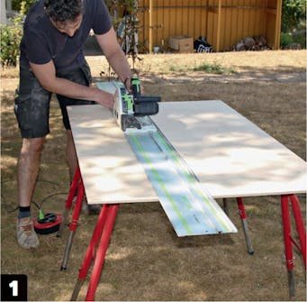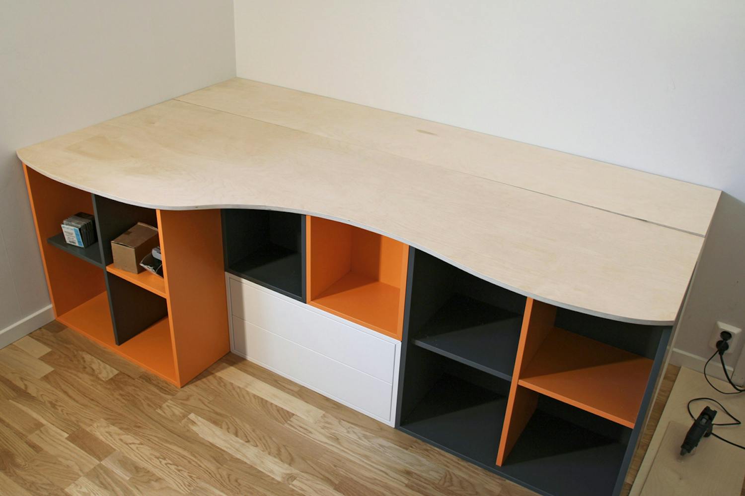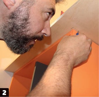 När alla läkt och ribbor är på plats och förstärkts med möbelvinklar, kan vi sätta igång med att såga till plywoodskivorna som ska ligga ovanpå ramen. Kanten på den skiva som ska ligga ut mot rummet ska ha en mjuk rundning som vi ritar för hand. Till sist skruvas skivan fast i skåpen och ramen.