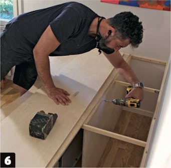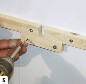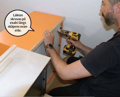 Läkt skruvas på skåpen. De ska fästas längs skåpens ovansida hela vägen runt, även längs väggen. Då får du en stark ram.