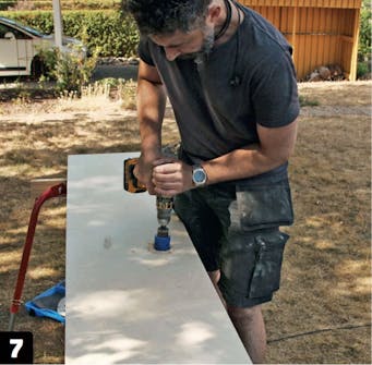 De tunna läkten förborras. Vi kommer att fästa läkten med 4,5 x 60 mm-skruvar på ca 10 cm avstånd. Vi förborrar läkten, så att skruvarna inte spräcker träet.