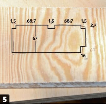 Markera på sängskivan. På skivan markerar vi var skåpen vid huvudänden ska vara, så att vi kan såga utanför det när vi ska rita upp och såga ut den mjuka rundningen.