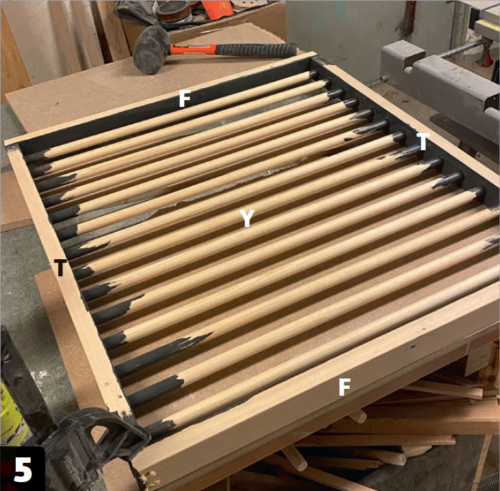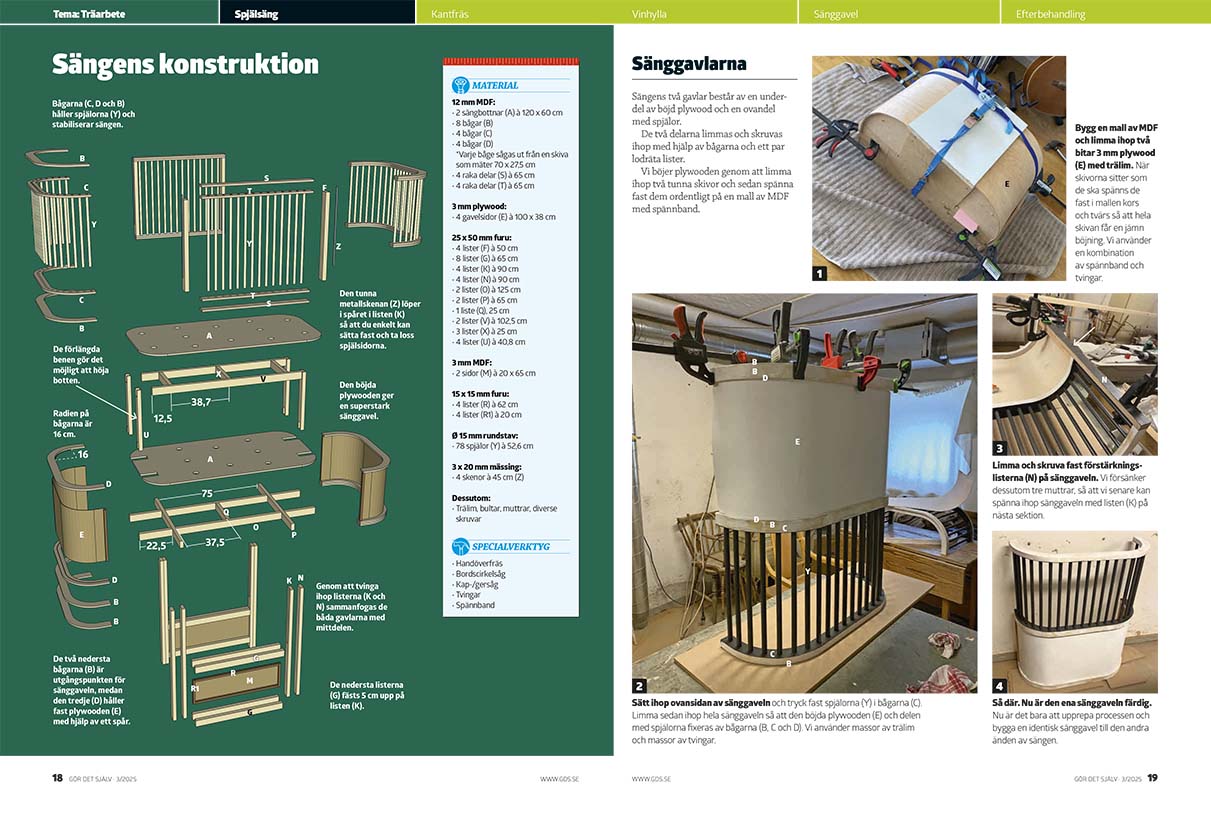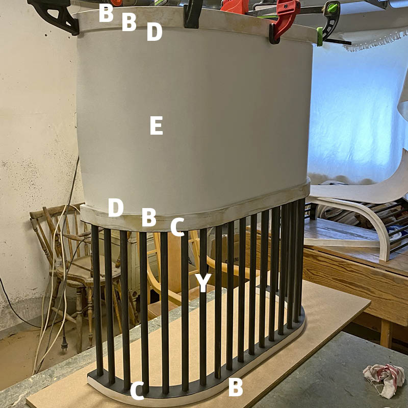 Sätt ihop ovansidan av sänggaveln och tryck fast spjälorna (Y) i bågarna (C). Limma sedan ihop hela sänggaveln så att den böjda plywooden (E) och delen med spjälorna fixeras av bågarna (B, C och D). Vi använder massor av trälim och massor av tvingar.