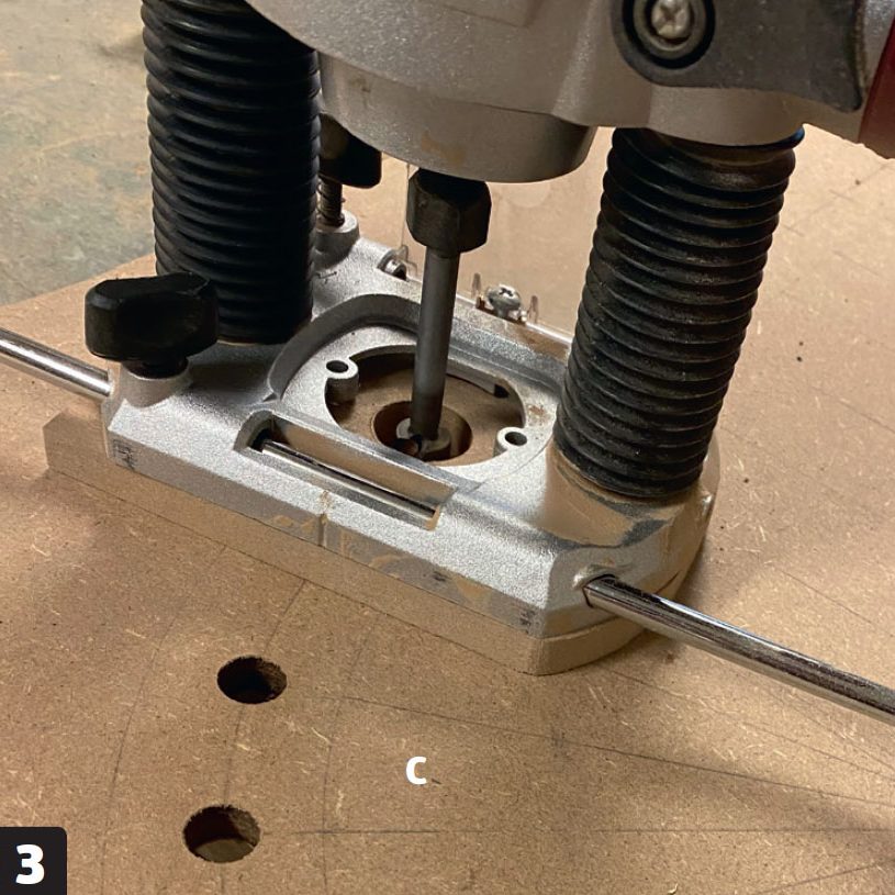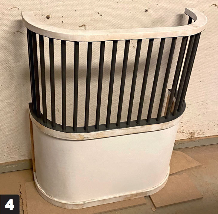 Mät upp för bågarna (C) på en ny MDF-skiva och borra hål för spjälorna innan du sågar ut dem. Vi använder en handöverfräs med en notfräs vars diameter motsvarar diametern på spjälorna. Som mall använder vi en stor kartongbit i skala 1:1.