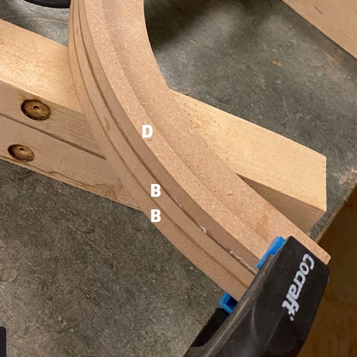 Lägg bågarna (B och D) ovanpå varandra, så att du kan se om de är likadana. Om du upptäcker en ojämnhet eller två, fräses eller sågas de bort tills alla bågarna är identiska.