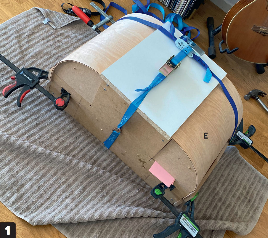 Bygg en mall av MDF och limma ihop två bitar 3 mm plywood (E) med trälim. När skivorna sitter som de ska spänns de fast i mallen kors och tvärs så att hela skivan får en jämn böjning. Vi använder en kombination av spännband och tvingar.