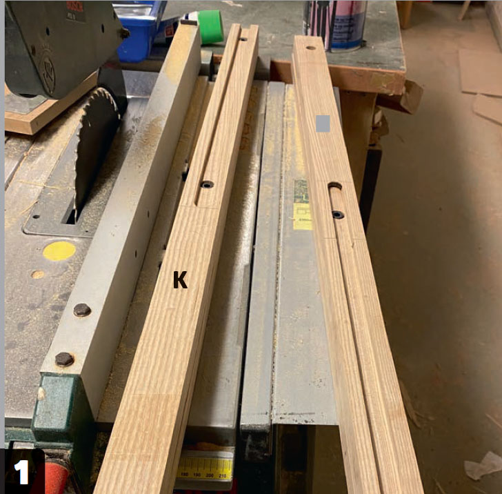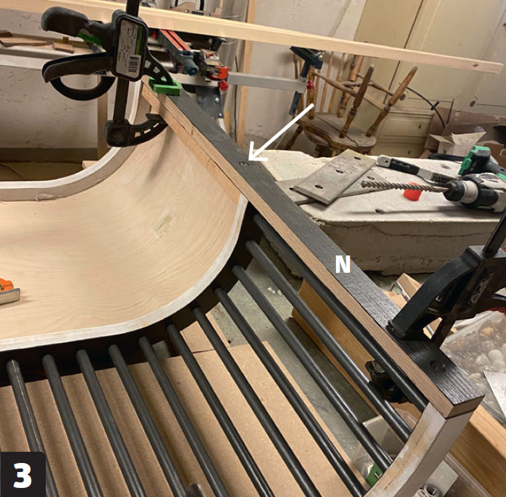 Limma och skruva fast förstärkningslisterna (N) på sänggaveln. Vi försänker dessutom tre muttrar, så att vi senare kan spänna ihop sänggaveln med listen (K) på nästa sektion.