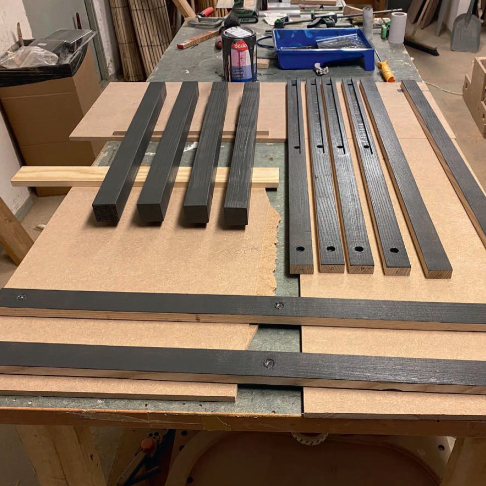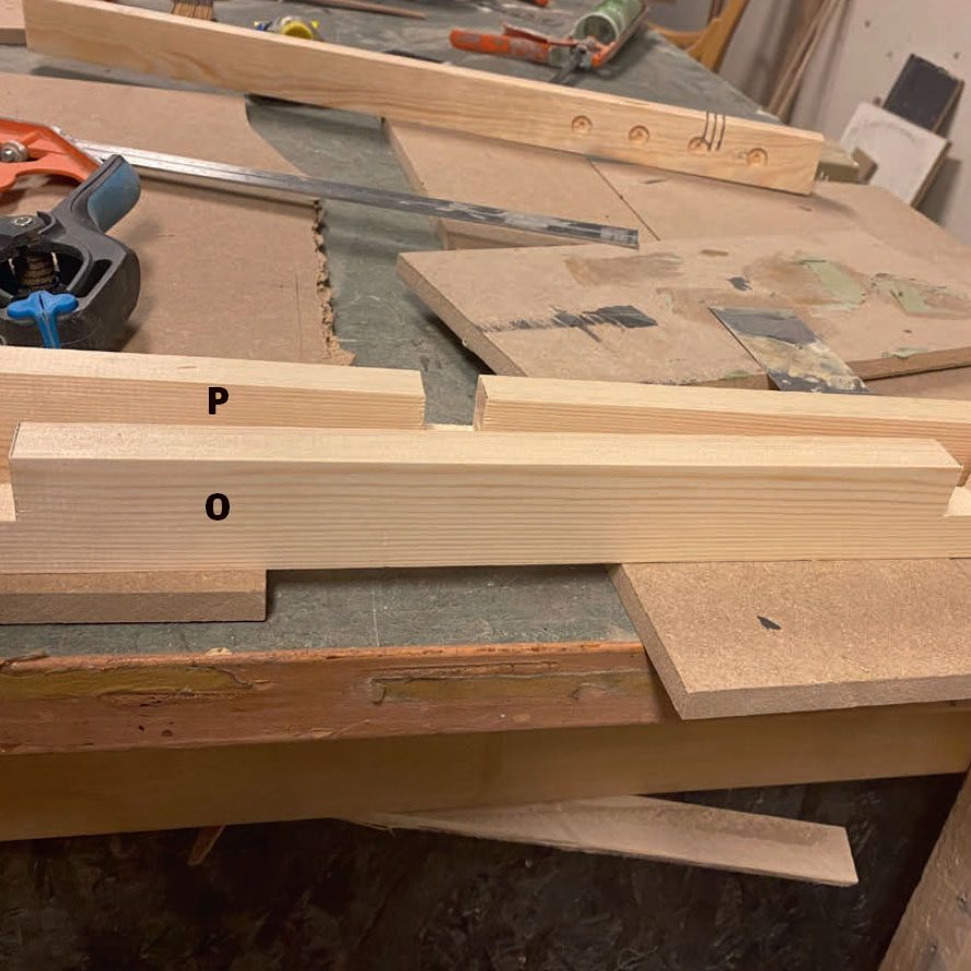 Såga till resten av listerna (O, P och G) och lägg upp dem på ett bord, så att du kan få en överblick och kolla så att de lister som ska vara helt identiska också är det.