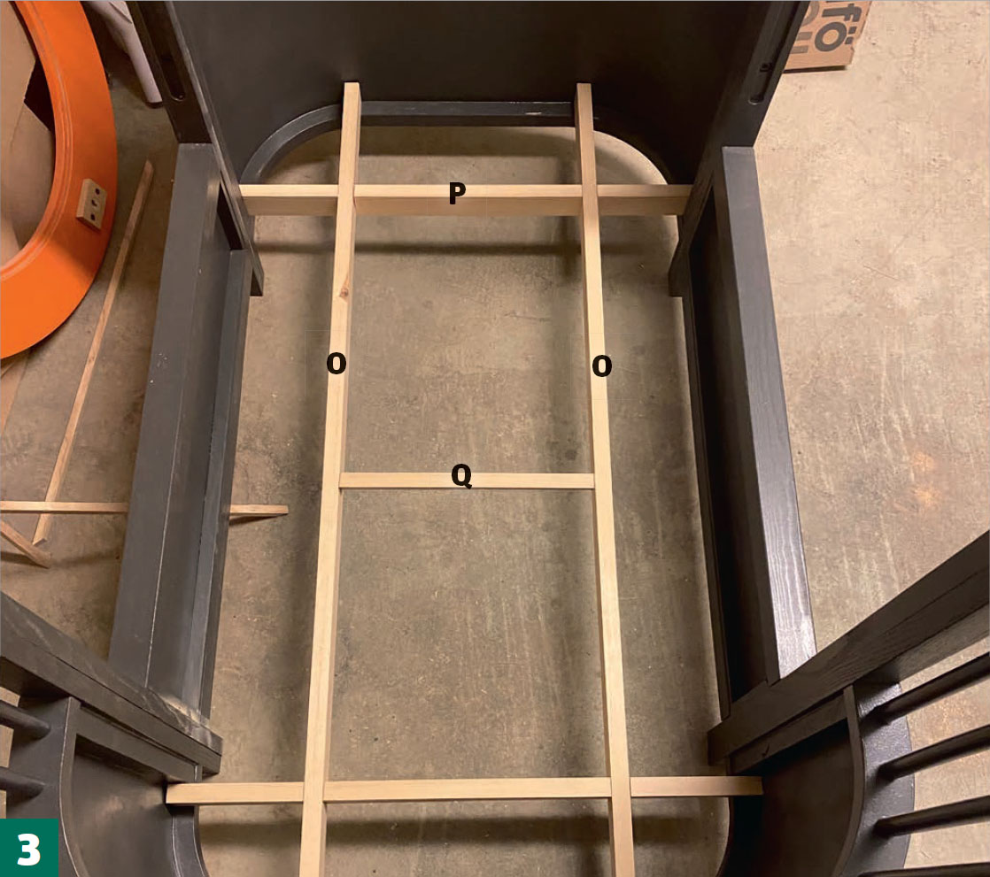 Placera listerna (O och P) i botten på sängen och tryck ihop dem, så att de bara blir en list höga. Vi låter listerna vila på sänggavlarnas nedre kant och sätter en kortling (Q) på tvären för att förstärka botten ytterligare. Vi fäster inte listerna i sängen, eftersom de inte kan flytta sig till den ena eller den andra sidan.
