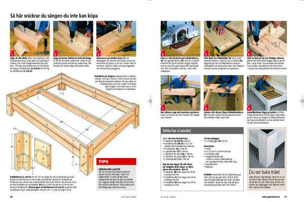 Materialet till en dubbelsäng på 140 x 200 cm går på cirka 1000 kr (inkl. olja till ytbehandling) men exkl. madrass och lameller. Nöjer du dig med att göra en enkelsäng kostar den runt 700 kr.