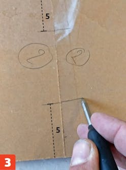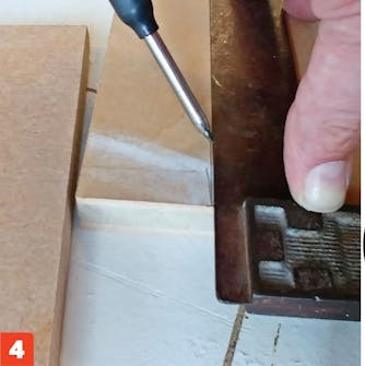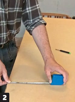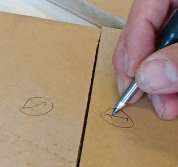 Markera var mitten av lamell kexen ska placeras. Markeringarna sätts cirka 5 cm in från varje sida av skivorna, och går över båda skivor.