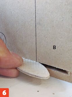 Pressa in ett kex i frässpåret, och kontrollera att det passar innan du fräser nästa spår i sidostyckena (B).