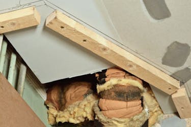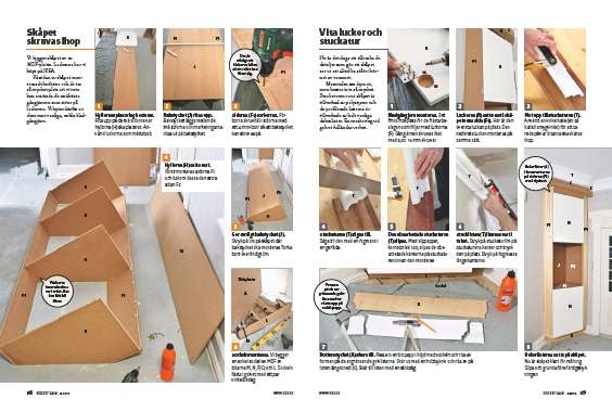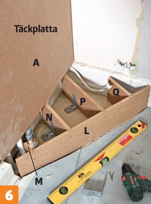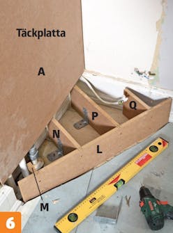 Skåpet ska täcka rör och avloppsstam efter en renovering. Det rör sig om en lösning som är skräddarsydd. Här är det mest förnuftigt att börja med att montera skåpets överdel som det färdiga skåpet ska fästas i. Överdelen skruvas fast i taket.