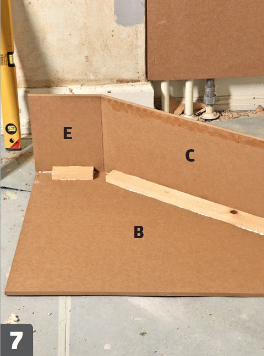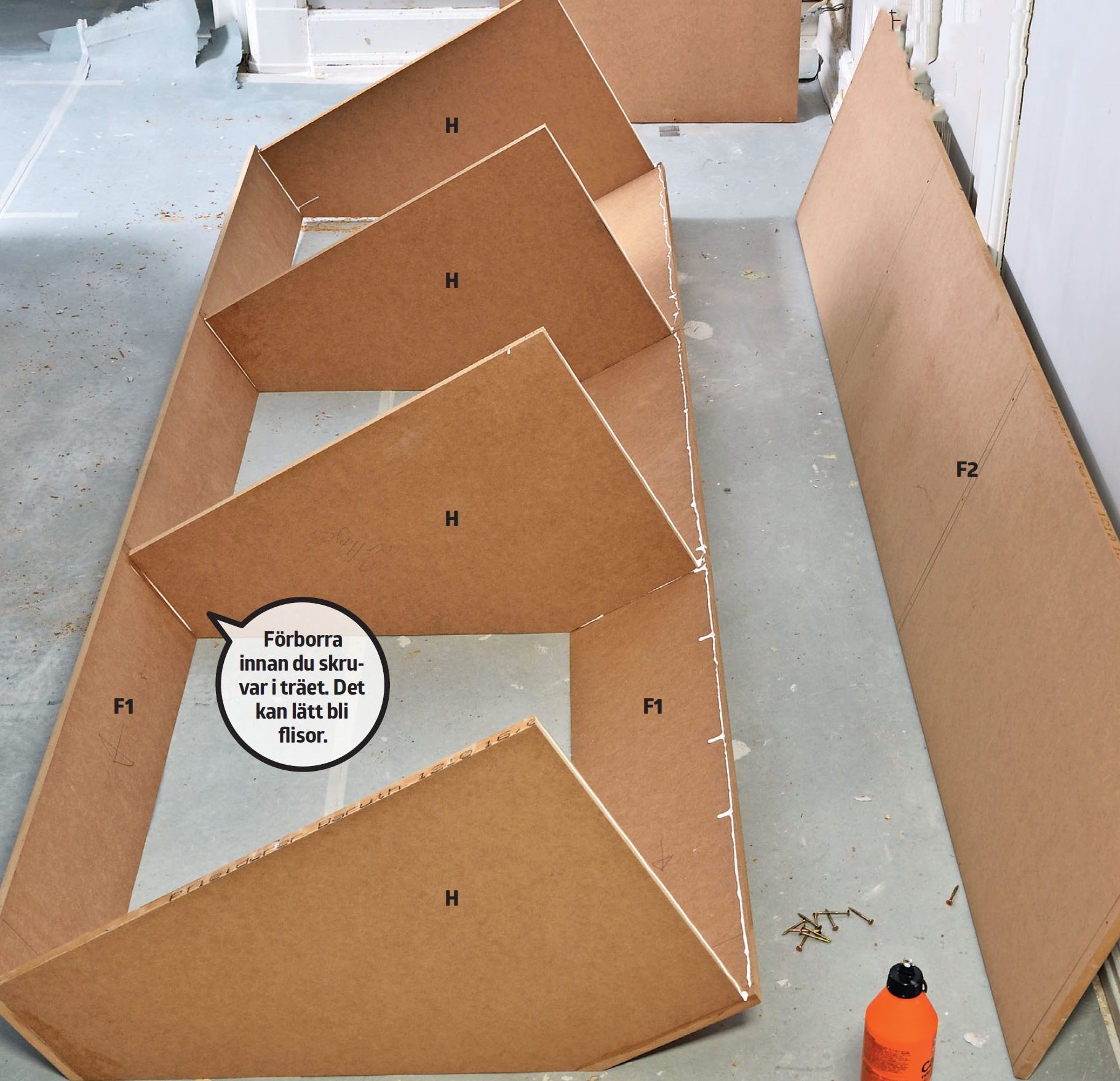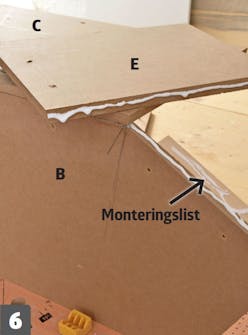 Nederdelen (B) skärs till. Rita upp nederdelen av ”lådan” på en bit MDF-platta. Passa därefter in de tre sidorna D, C och E så att de kan skruvas fast.
