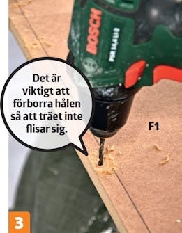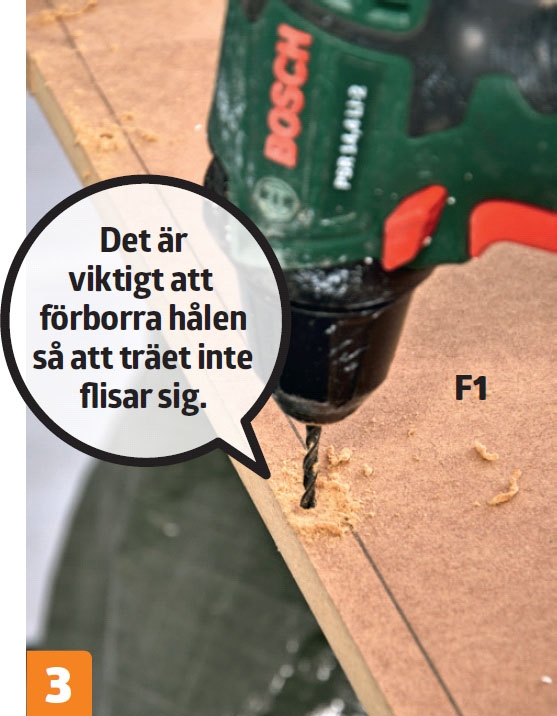 Sidorna (F1) förborras. Förborra skruvhål i sidorna med ett 4 mm-borr så att bakstycket kan skruvas på.