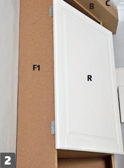 Luckorna (R) sätts fast i skåpets ena sida (F1). Här är den översta luckan på plats. Den nedersta luckan monteras på samma sätt.