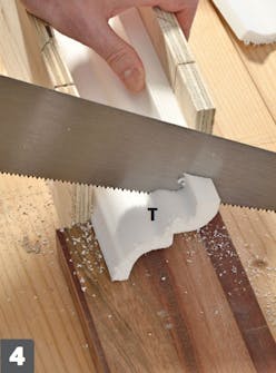 Mät upp till stuckaturen (T). Använd en vinkelhake (en så kallad smygvinkel) för att ta reda på var bitarna ska skäras ihop.