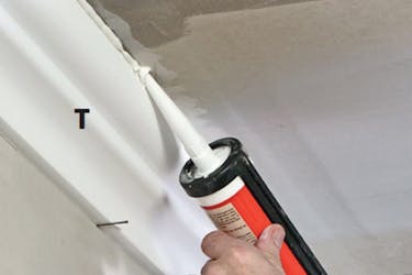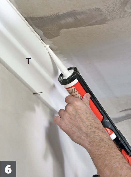 Stucklisten (T) limmas fast i taket. Stryk på stuckaturlim på stuckaturens kanter och tryck den på plats. Stryk på fogmassa längs kanterna.