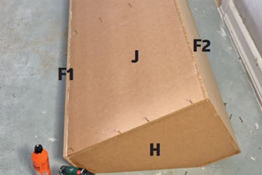 Bottenstycket (K) skärs till. Passa in en bit papp i höjd med sockeln och rita av formen på de angränsande golvlisterna. Skär ut med en hobbykniv och rita av på listen längst ned (K). Skär till listen med en sticksåg.