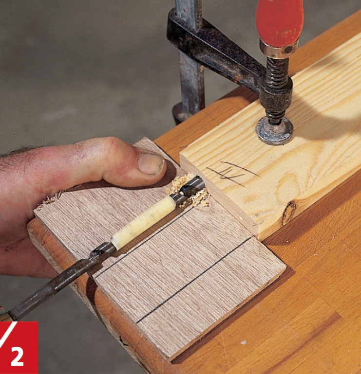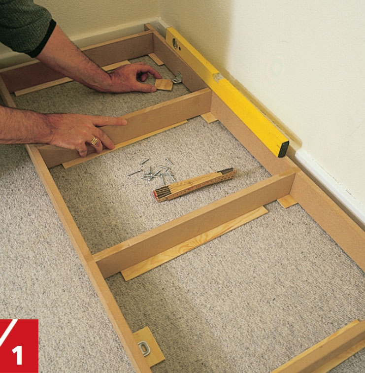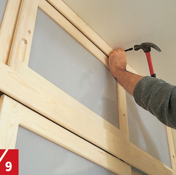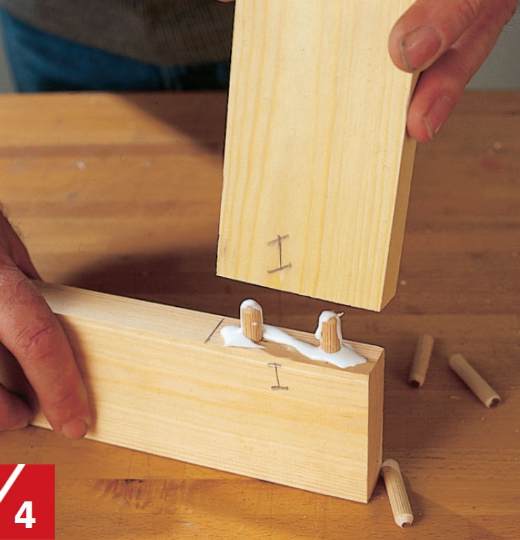 Häll ett par droppar lim i hålen i de vågräta listerna och stick sedan ner 40 mm långa pluggar. Häll lim i hålen i de lodräta listerna och knacka försiktigt ihop listerna.