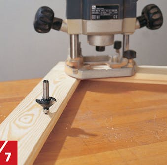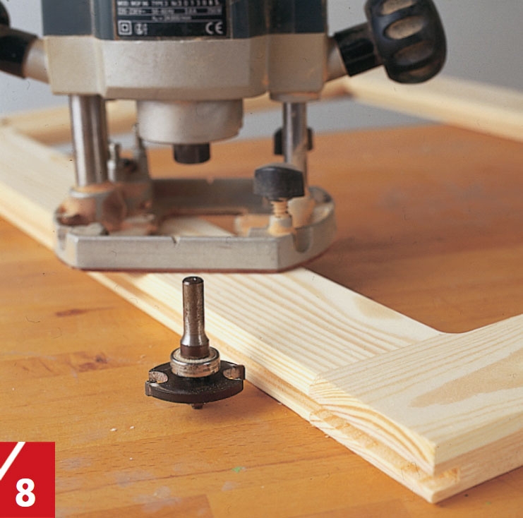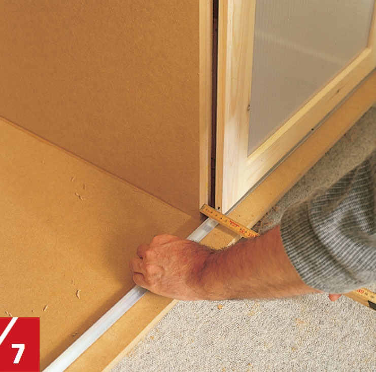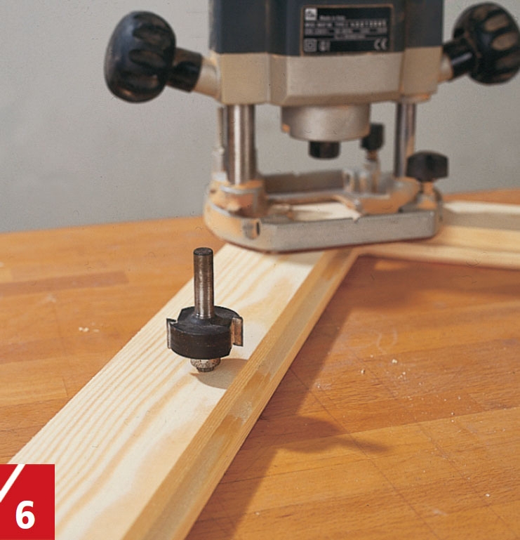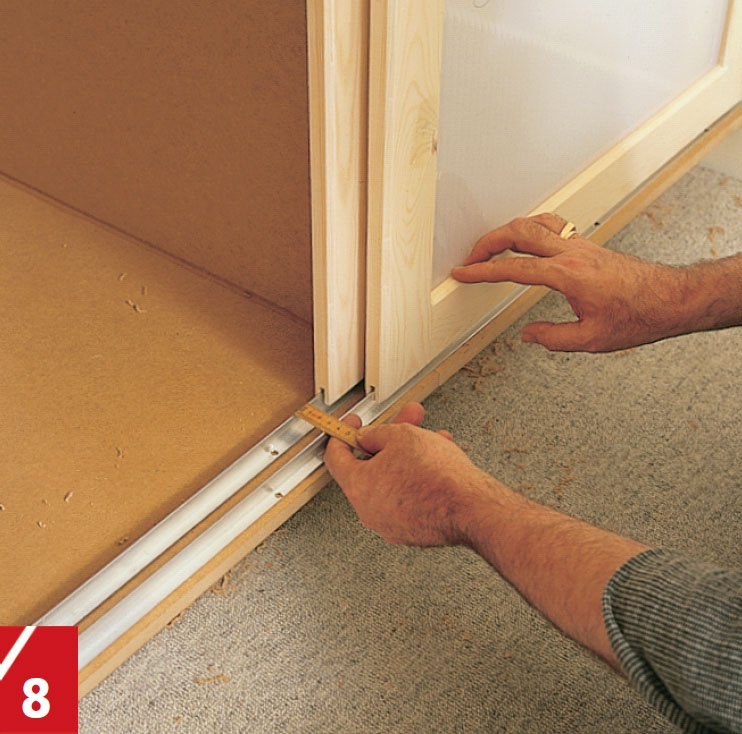 Till styrskenan i botten på garderoben fräser vi ett spår på undersidan av varje dörr. Spåret, som är 8 mm brett, läggs mitt på kanten av listen och görs 15 mm djupt.