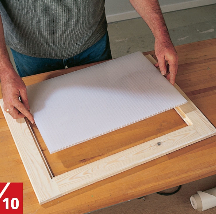Som speglar valde vi kanalskivor av polykarbonat. Kanalerna vänds så att de är stående när dörrarna är på plats. Plastskivorna läggs plant medan de sågas till önskad storlek.