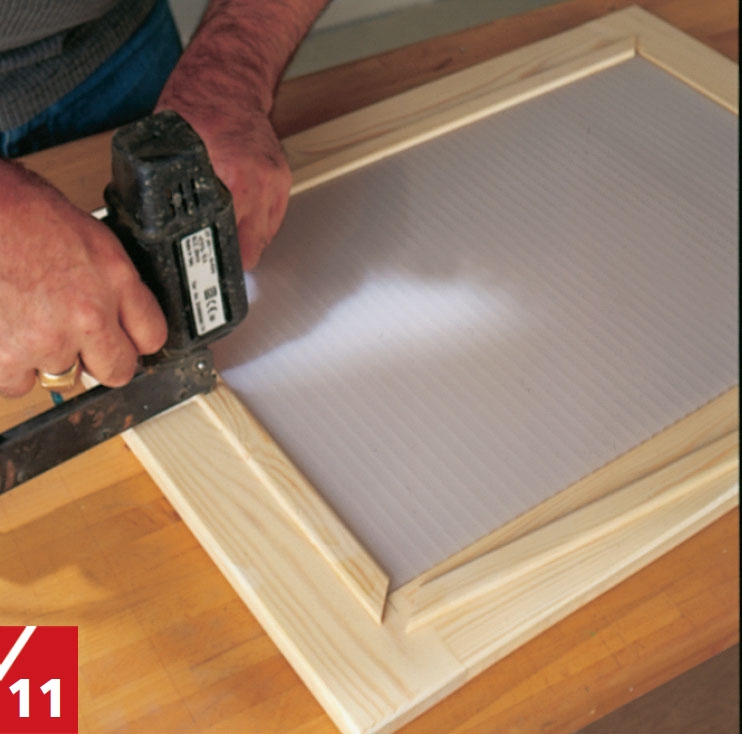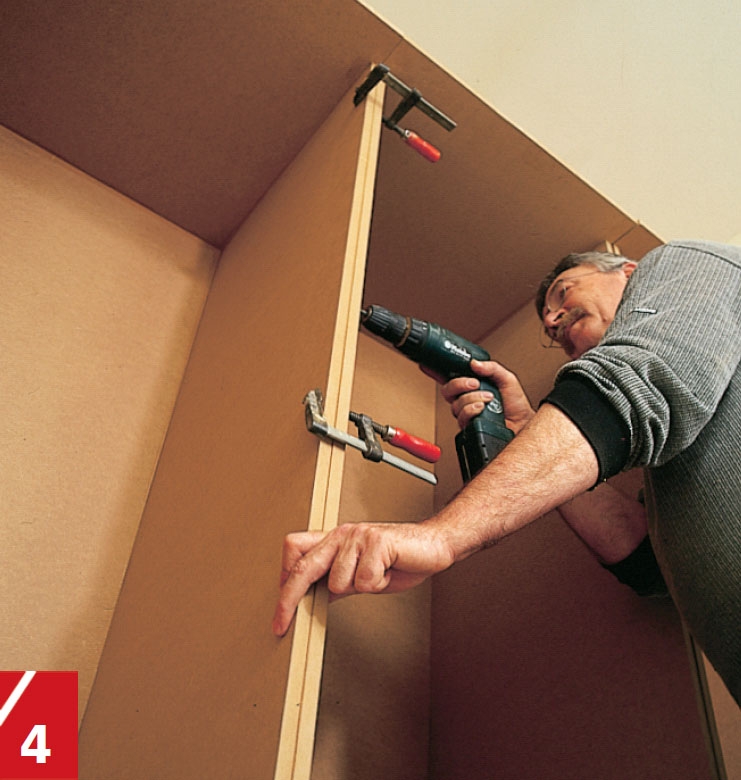 Sätt dörrarna i spänn med tvingar medan limmet torkar. Kontrollera med vinkel att ramen blir vinkelrät. Senare blir det nämligen svårt att korrigera en avvikelse.
