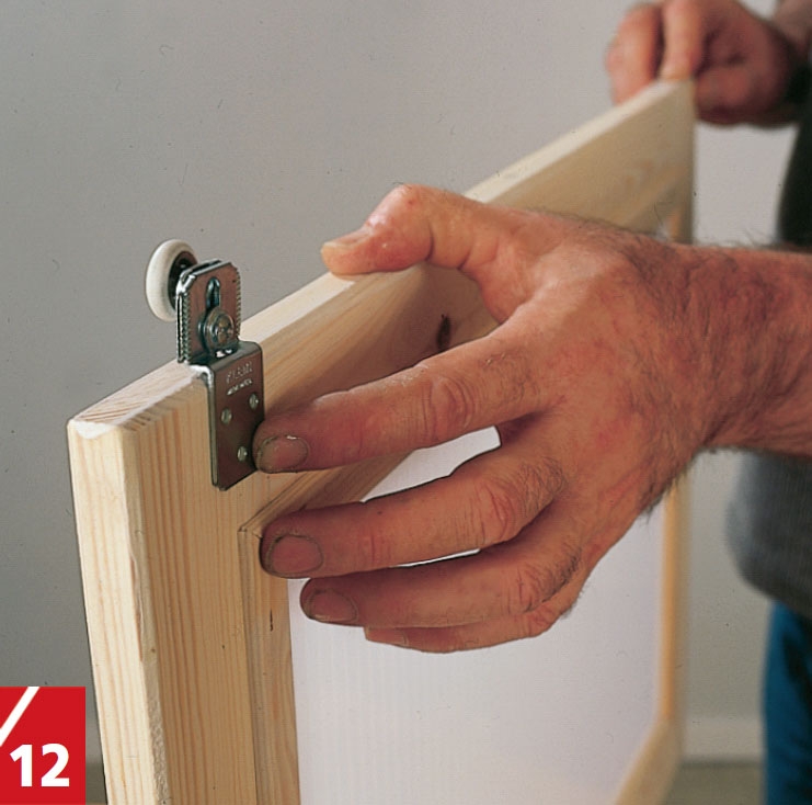 När du har satt fast de två bakre dörrarna kommer turen till den främre. Häng den lodrätt, skjut in T-profilen och skruva fast den.