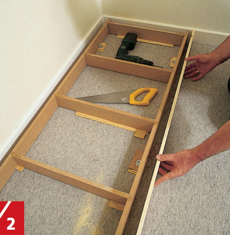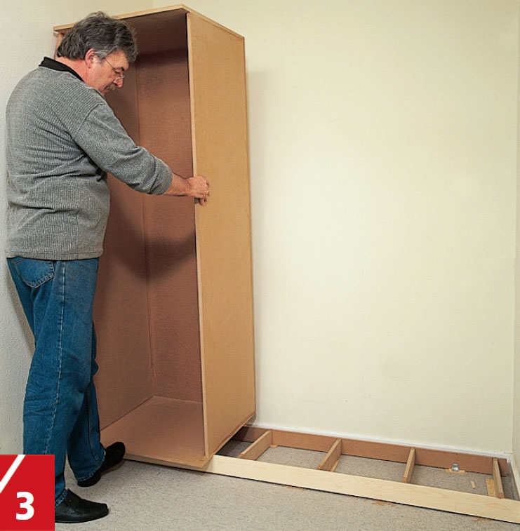 Sätt de tre garderoberna på plats men vänta med att skruva ihop dem. Kontrollera först att allihop står rakt och att ovansidan är vågrät. Justera om så behövs med små passbitar.