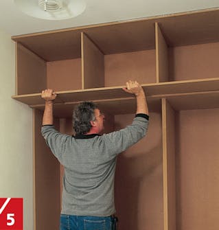 Kalla på en medhjälpare och lyft upp den övre modulen. Tryck in den tills framkanten fluktar-med framkanten på underskåpet. Lås den nu med skruvar genom garderobens ovansida.