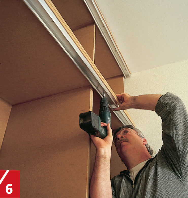 Rullarna, som sätts på skåpsdörrarna, skall sitta i en alu-skena. Denna monteras på skåpet under den utstickande delen. Dra in skenan cirka en halv centimeter från framkanten.