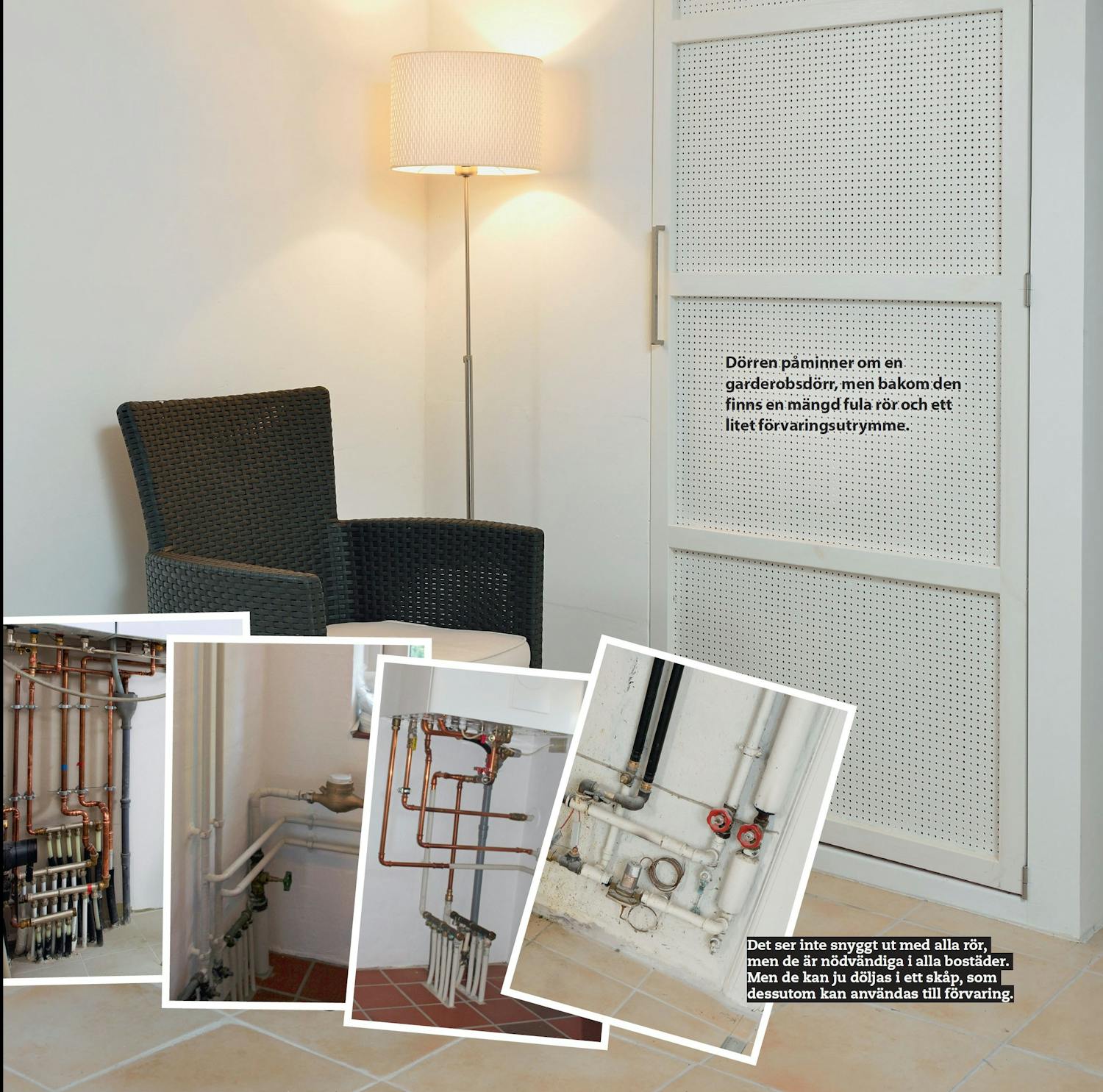 När du mäter upp för reglarna måste du ta hänsyn till om det finns rör i taket. Den enkla regelstommen snickras av stående reglar från golv till tak och vågrät reglar mellan dem. På utsidan av stommen monteras mdf-skivor som väggmaterial. Lägg märke till att du ev. ska överföra rörens form till ovansidan på mdf-skivan. Se nedan hur du gör en mall för att överföra formen.
