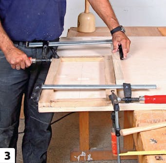 Stryk trälim på pluggarna och i hålen. Bygg ihop hela ramen. Lägg den på en helt plan yta, och se till att den är i vinkel innan du spänner fast den med ett par skruvtvingar. Låt torka i minst 30 minuter.