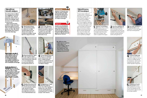Under varje skjutdörr fräses ett spår som ska glida över styrskenan. Spåret är 4 mm brett och 12 mm djupt. Upptill skruvas rullarna fast på dörrarnas baksidor med tillhörande skruvar.