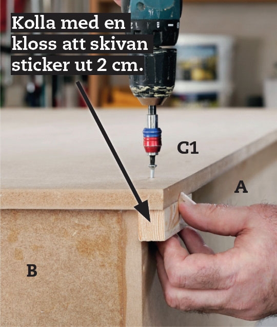 Toppskivan C1 fästs sedan på sidorna B, även här med 3,5 x 40 mm skruvar på var 25:e cm. Förborra och försänk skruvarna. Se till att sidorna står parallella och fästs vinkelrätt mot toppskivan.