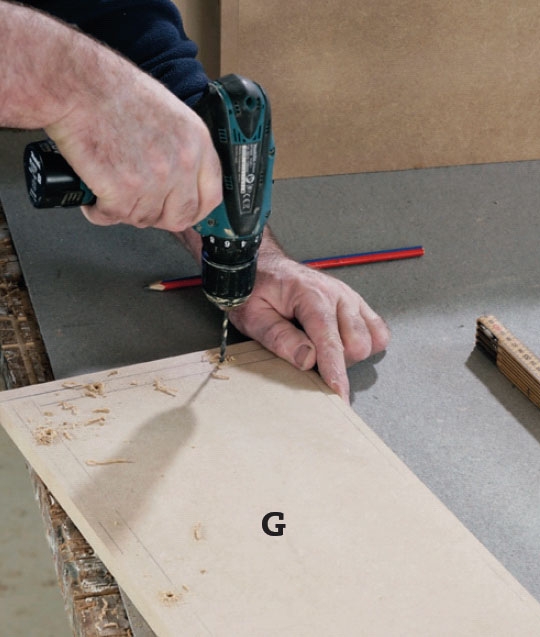 Förborra noga för skruvarna. Det är extra viktigt på lådframstycket G. Markera sidornas placering med vinkel så blir det lättare att dra i skruvarna på rätt ställe.